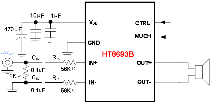 HT8693 features Anti-Clipping Function (ACF) which detects output signal clip due to the over input signal and suppresses the output signal clip automatically. Also the ACF function can adapt the output clip caused by power supply voltage down with battery. It can significantly improves the sound quality, creating a very comfortable musical enjoyment, and to protect the speakers from overload damage. It also supplies ACF OFF mode.