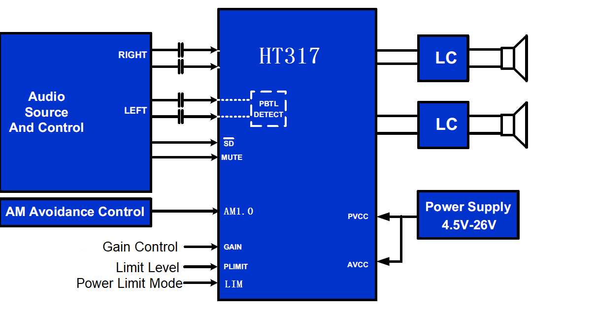 HT317 is a stereo efficient, Class-D audio amplifier for driving speakers up to 75W/4 ? in mono PBTL. It can also deliver 2×30W/8Ω power in stereo BTL.