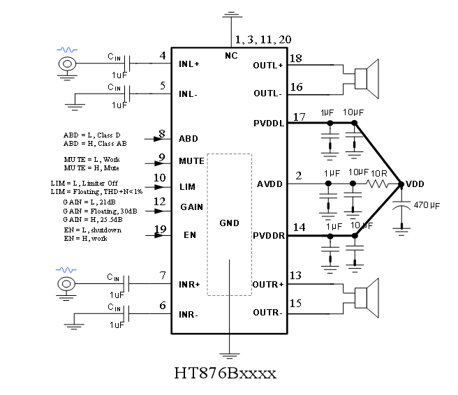 HT876 integrates adjustable Limiter Function, which can be set by a resistor at the LIM pin to ground or AVDD, so that the output music can be limited below the preset power and THD+N.