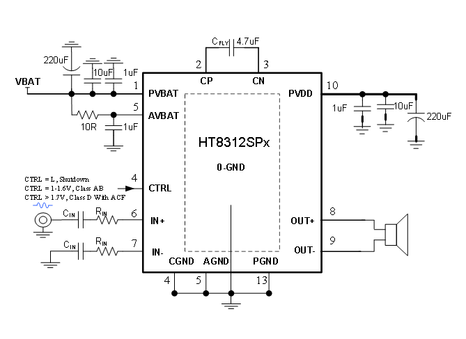 Class AB amplifier mode is also available for HT8312. Once the EMI Interference from class D and Boost Converter becomes an annoying problem, HT8312 can be changed into Class AB mode.