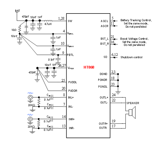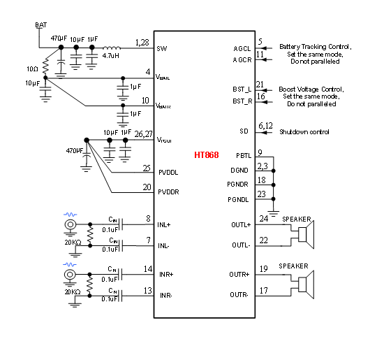 The HT868 is a smart audio power amplifier with TFB, AGC technology and an integrated adaptive sync boost converter that enhances efficiency at low output power. It drives up to continuous 10W (3% THD+N, boosted to 8.0V) into 3ohm speaker, or instantaneous 2×6.5W (1% THD+N, boosted to 8.0V) into 4ohm speaker from a Li-battery voltage.