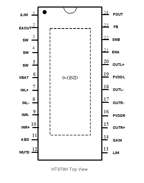 HT878T has a filter-less modulation circuit which can directly drive speakers. HT878T can be shut down so that the power consumption can be minimized. As for protection function, over current protection function for speaker output terminals, over temperature protection function and low supply voltage malfunction preventing function are also prepared.