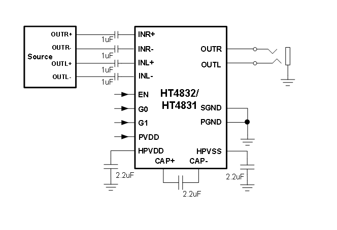 HT4832 / HT4831 features stereo inputs that can be set in either differential or single-ended input. 4 different gain with different built-in resistors reducing external component is selectable.
