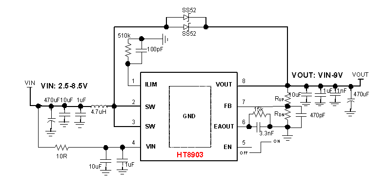The HT8903 has an input voltage range from 2.5 V to 9V to support applications with single cell and two cell Lithium batteries. The device has 7A switch current capability and can provide an output voltage up to 9V.