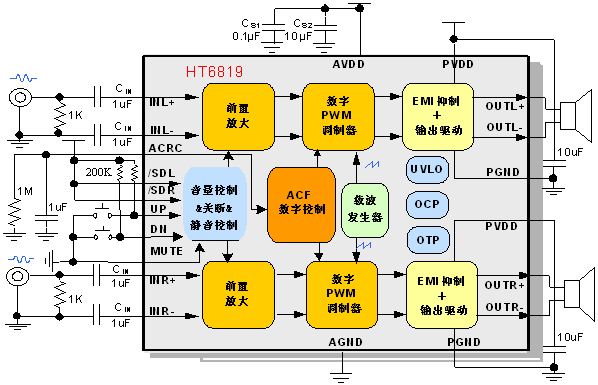 此外,HT6819内置的关断功能使待机电流最小化,还集成了静音功能、左右声道独立关断、扬声器输出端过流保护、片内过温保护和欠压异常保护等功能;采用无铅ETSSOP20封装形式。