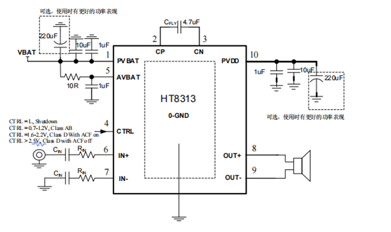 HT8313具有AB类和D类的自由切换功能,在受到D类功放EMI干扰困扰时,可随时切换至AB类音频功放模式(此时电荷泵升压功能关闭)。