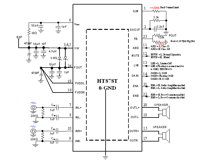 此外,HT878T内部集成免滤波器调制技术,能够直接驱动扬声器,内置的关断功能使待机电流最小化,还集成了输出端过流保护、片内过温保护和电源欠压异常保护等功能。