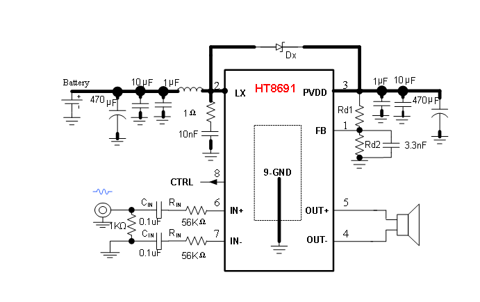 HT8691 内置BOOST升压和防破音功能的9.0WD/AB类音频功率放大器。