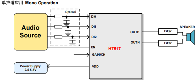 HT517是一款低成本的I2S输入单声道输出D类音频功率放大器。其在5V供电时可提供最大3.1W的输出功率;在3.7V供电时可提供最大180mW的输出功率。