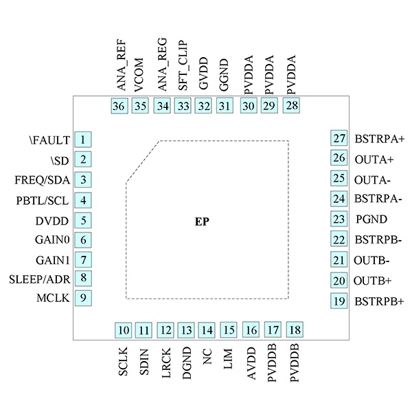 4 | PBTL/SCL | I | 硬件控制模式,PBTL设置控制输入;软件I2C模式,SCL时钟输入 |