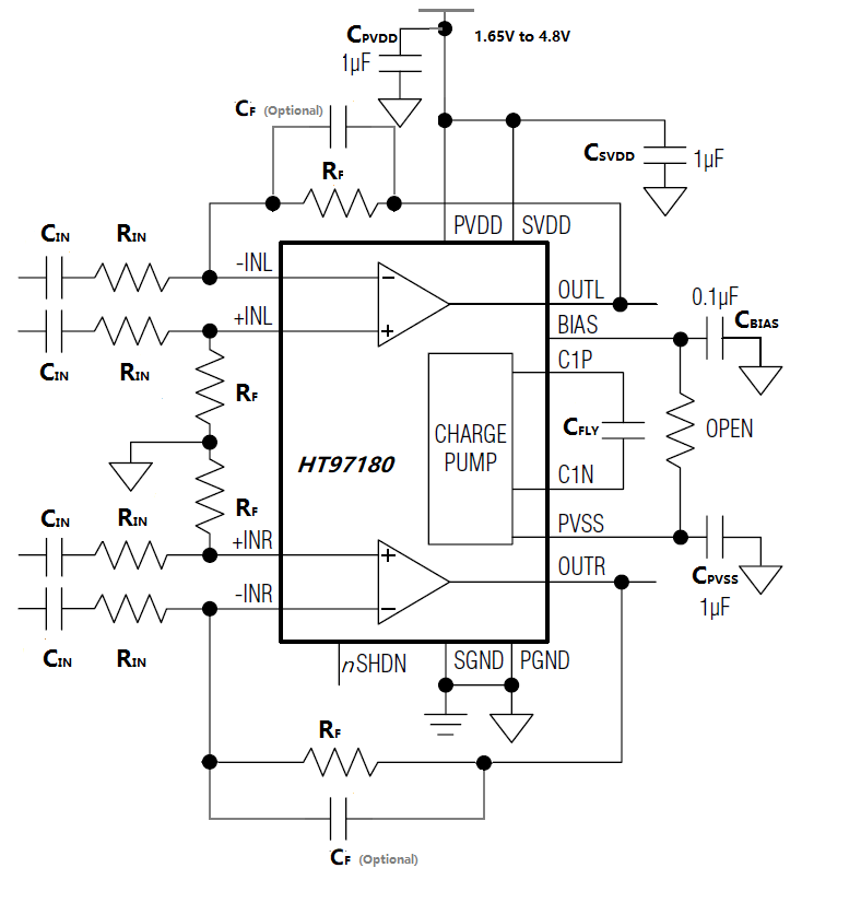 器件内部集成电荷泵产生负电压,器件输出级由输入正电压和该负电压驱动,使得输出偏置在零电位,省去了大尺寸、容易引入失真的输出耦合电容。